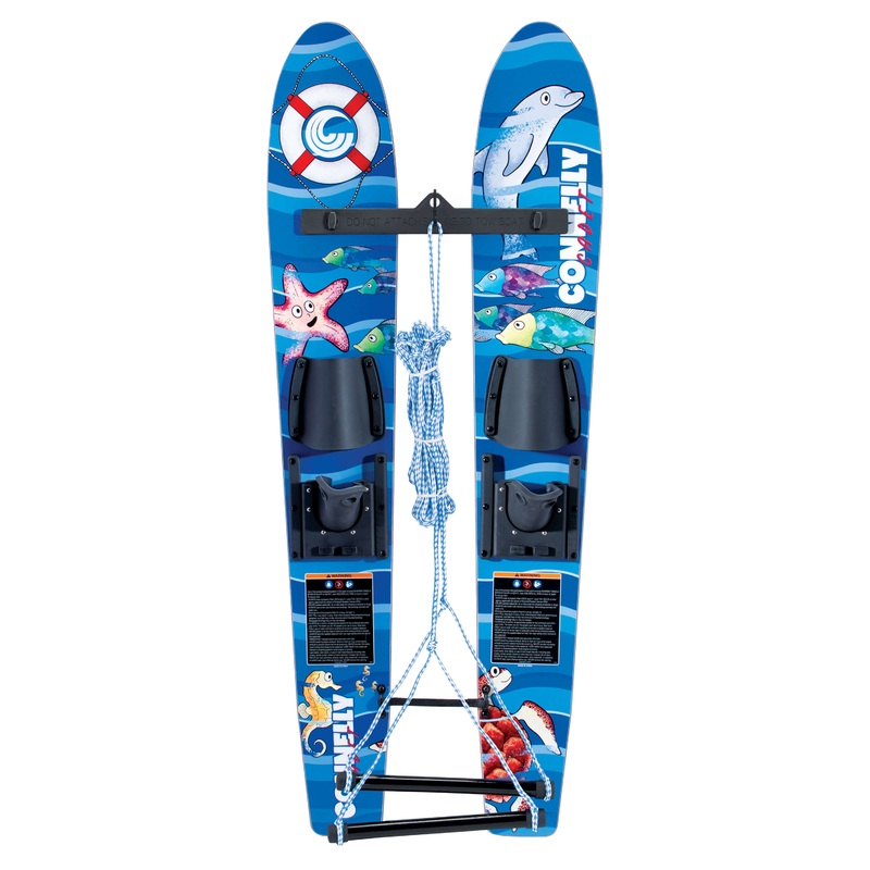 The Cadet trainers will set your aspiring skier up for success. A removable stabilizer bar, with direct rope attachment, helps to keep the front and back end of the skis in place while taking some load off of your kiddo. The two-handle Cadet rope allows an adult to safely control the pull from the boat and in case of a fall, just let go! Your little cadet will actually have FUN learning with these skis.